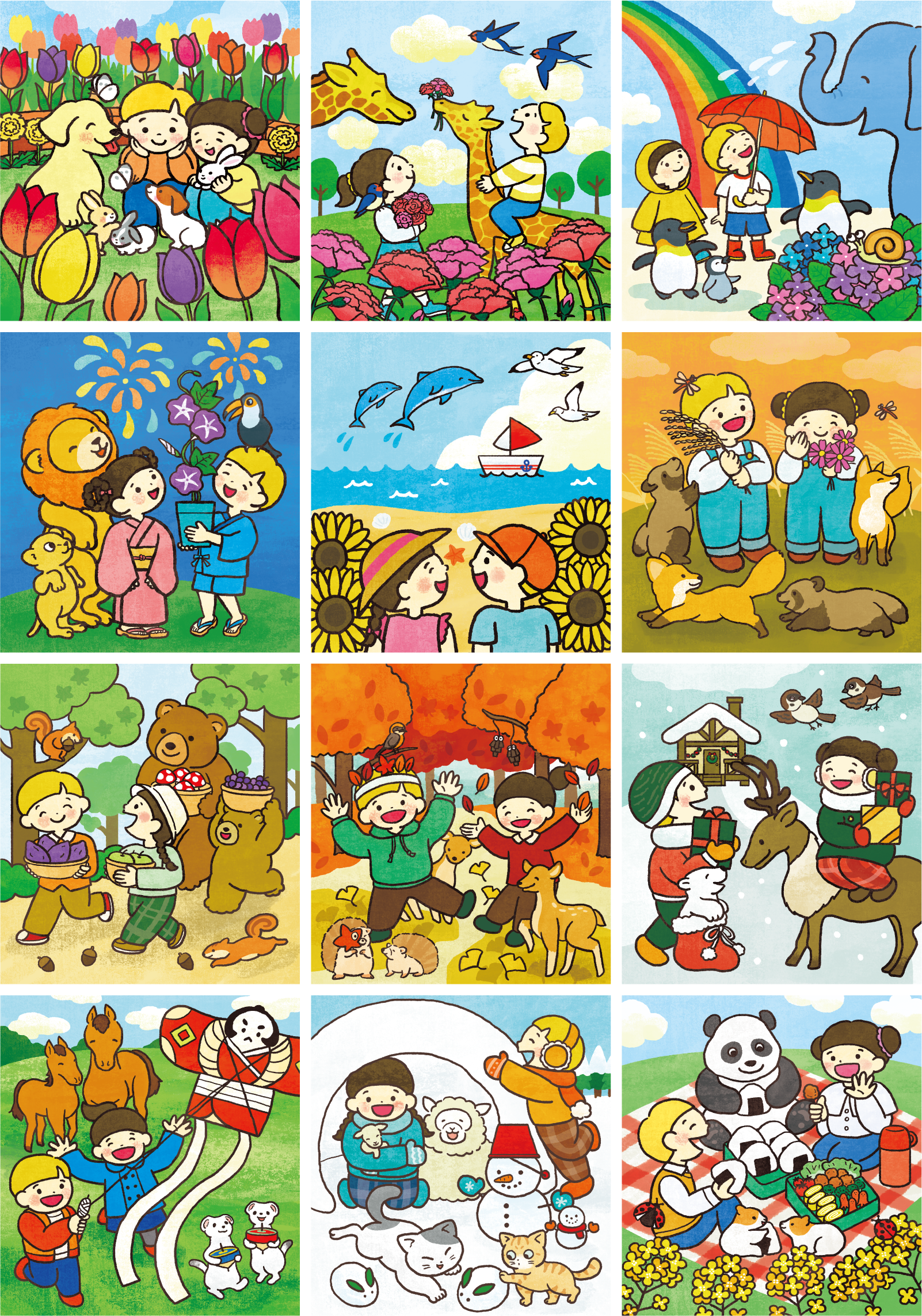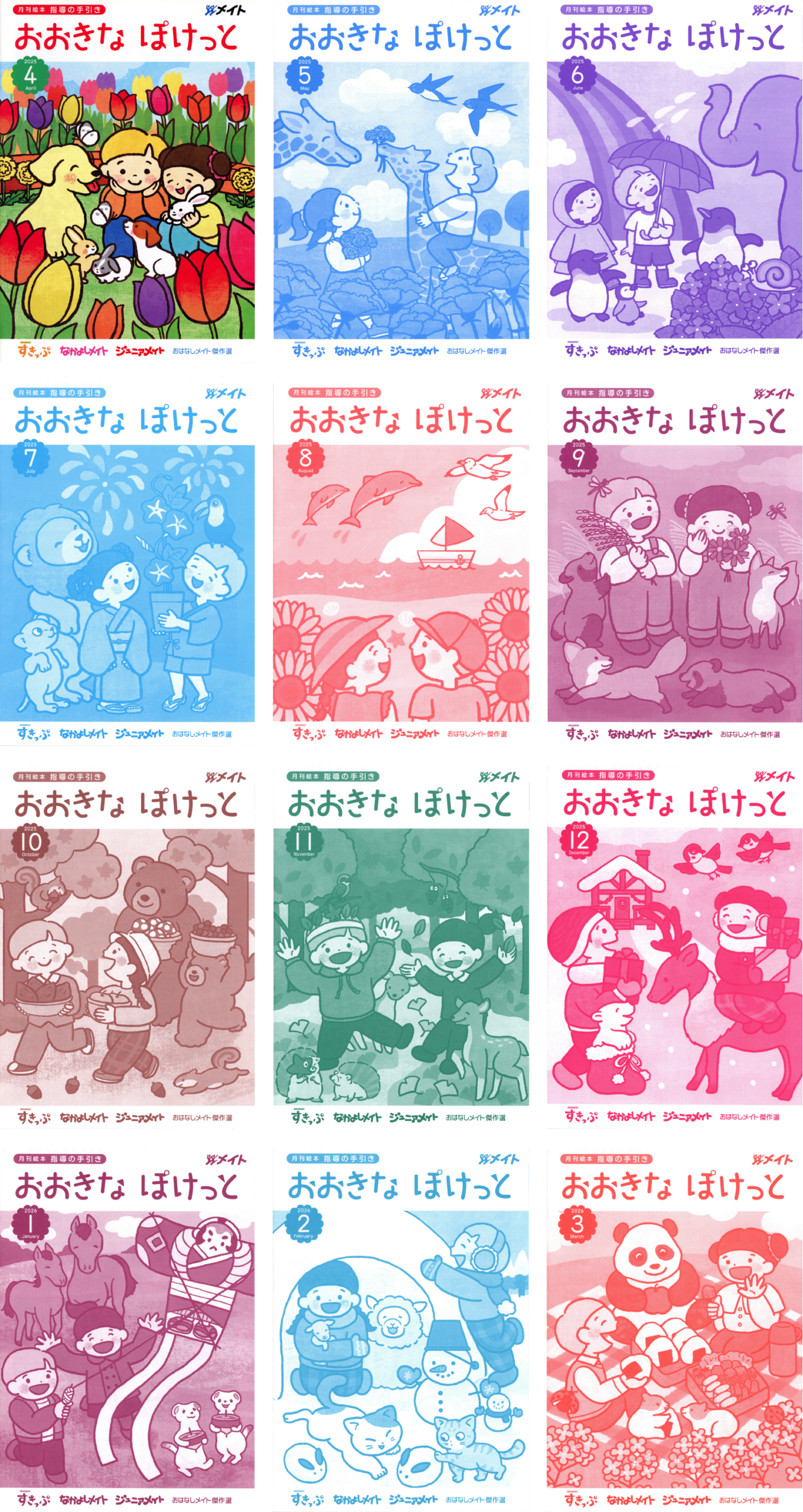 4月号はフルカラー、5月号以降は季節に合わせた1色カラーで発行され、各月2人の子どもたちとどうぶつたちが登場しています。